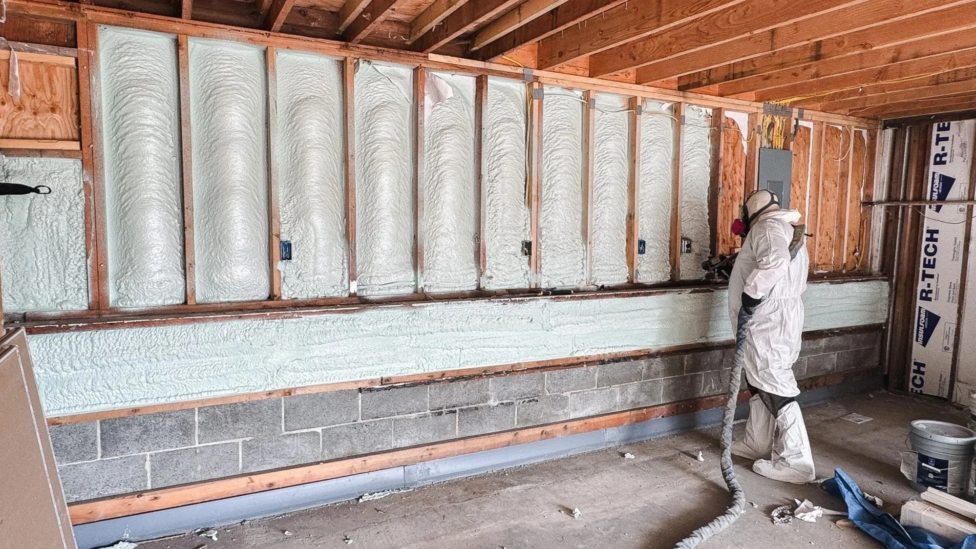 Worker in protective gear spray foaming the walls and ceiling of a building interior.